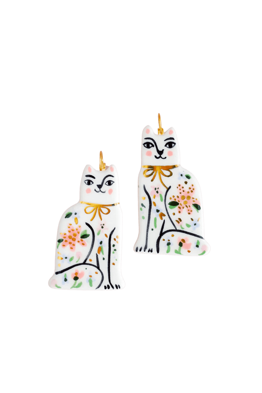 CAT EARRINGS! The accessory you didn't know you've been waiting your whole life for has arrived. Aren't they gorgeous? We worked with Romanian ceramicist and illustrator Livia Coloji of Gruni Ceramica to give her signature cat earrings a whimsical wallflower spin. And the results are beyond!
