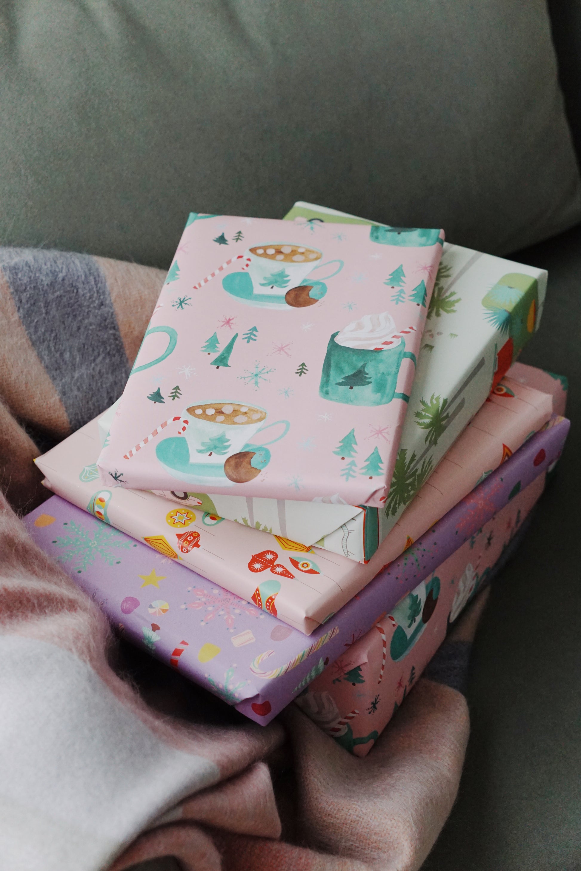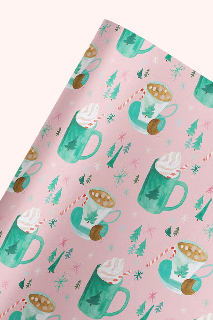 Minty hot cocoa with marshmallows and whipped cream, ginger snap cookies, and candy canes dance on a light pink background on this charming holiday gift wrap. Each sheet of wrapping paper is offset printed in Colorado on SFI-certified uncoated paper using vegetable-based inks. Please note that this is one roll of three separate 19.5 x 27" sheets (approximately the size of a standard shirt box), not a continuous roll.
