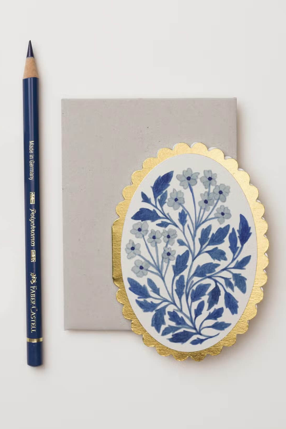 In case you're wondering what's even cuter than handmade greeting cards, it's mini handmade greeting cards! From Wanderlust Paper Co's Flora collection comes a beautiful blue floral illustration on the front of an oval scalloped mini card with gold foil edges. Each one is paired with a recycled grey flecked C7 envelope.